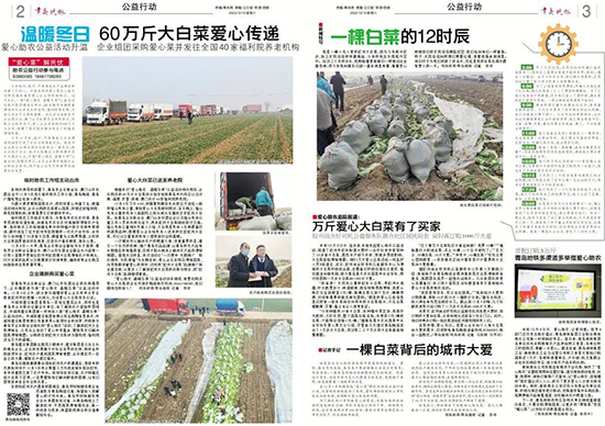 根據(jù)本次”愛(ài)心助農(nóng) 溫暖冬季“公益活動(dòng)相關(guān)規(guī)劃,企業(yè)購(gòu)買的60萬(wàn)斤大白菜將分批發(fā)放到青島市內(nèi)四區(qū)以及濟(jì)南、淄博、東營(yíng)、珠海、澳門共計(jì)40家福利院養(yǎng)老院。